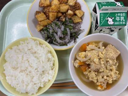 【献 立】 ごはん 牛乳 魚とじゃがいものごまがらめ ゆかり和え 親子煮