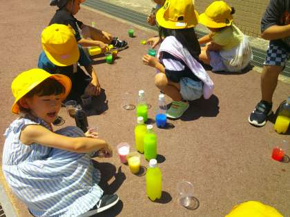 を作りました。プラスチックのコップに違う色水同士を入れると、色が混ざることも楽しみました。