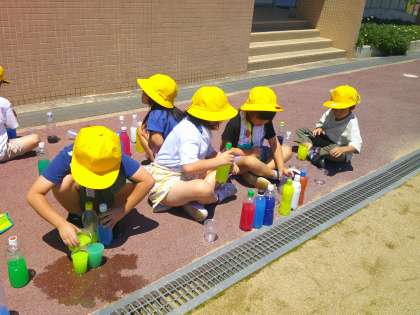 今日は、ペットボトルに水と絵の具を入れ、きれいな色水