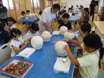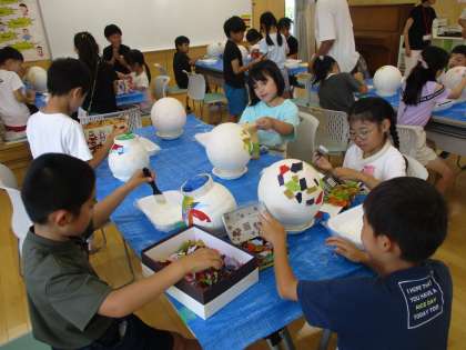 事前に準備していただいた教材に、子供たちがちぎった和紙を思い思いに貼り付けていきました。