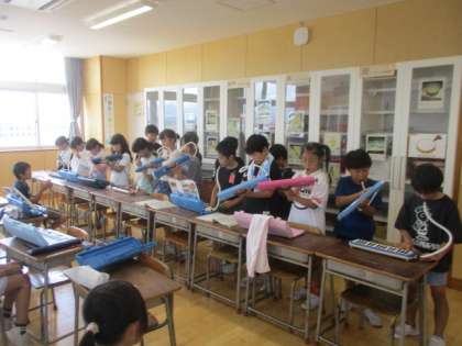 2拍子のリズムに合わせて「ゆかいな木きん」を演奏しました。他のパートの音をよくききながら、グループの友達と2拍子のリズムを合わせて演奏することができました。鍵盤ハーモニカも、リコーダーも上手になっています。