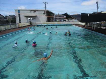 夏休み中、3年生の子供たちがプールに入ったり、図書室で本を読んだりしに来ています。
