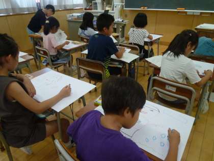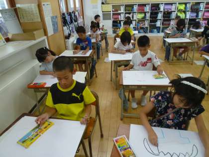 夏の思い出を、画用紙に描き表しています。丁寧に描いている姿が印象的でした。
