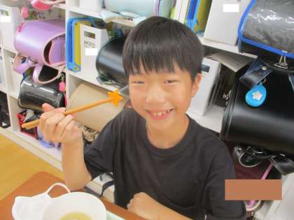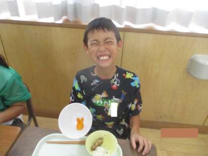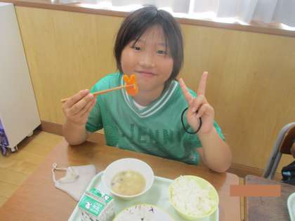 お月見献立の日、子供たちは型抜きされたウサギ型のにんじんやお月見ゼリーに大喜びでした。