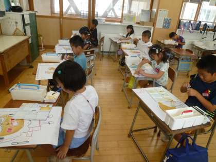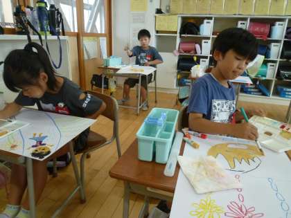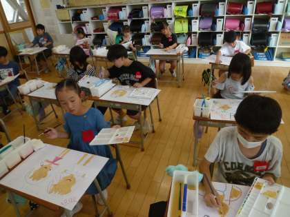 今日は、水彩を使って色塗りをしました。1年生のときに習ったことを思い出して、丁寧に塗っています。とても上達しています。