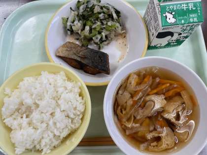 【献 立】 ごはん 牛乳 魚のかば焼き 梅肉和え 沢煮椀