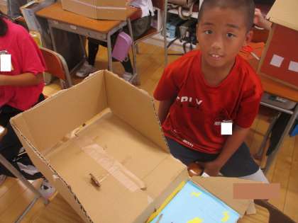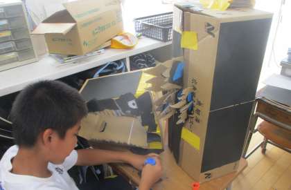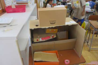 3年生のクミクミックスの勉強を活かして作品づくりをしている子供もいて、思い思いのダンボールボックスになってきています。