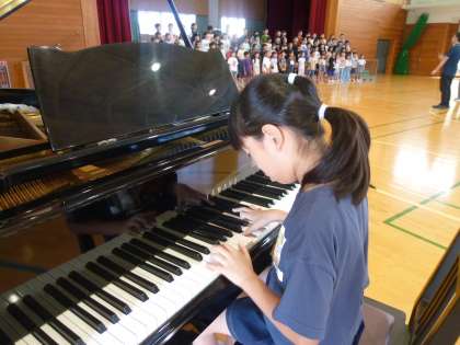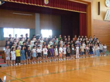 強弱や伸ばす部分を意識して歌っています。元気の良い声が体育館に響き渡っていました。