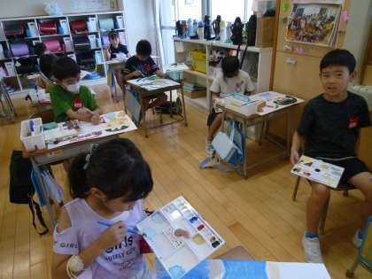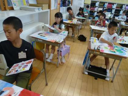 水彩を使って、色を塗っています。色を重ねたり、混ぜたり、工夫しています。