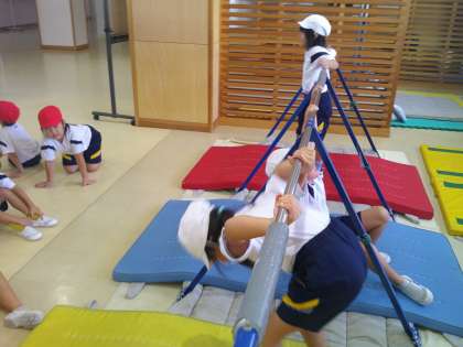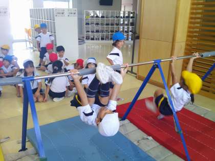 今週から体育では、鉄棒遊びをしています。ぶら下がり技や支え技・回り技など、たくさんの技に挑戦しています。