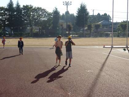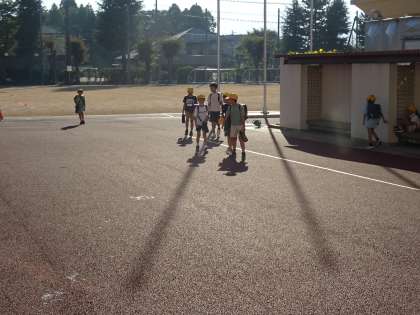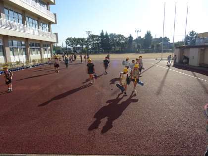 朝日を浴びて、元気に登校する奥北の子供たちです。