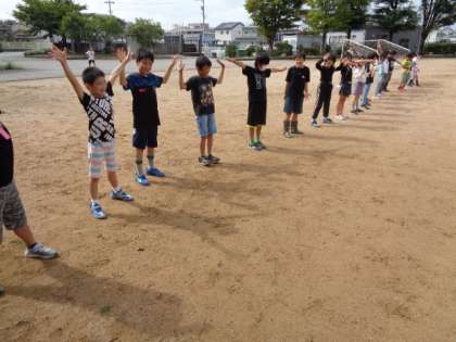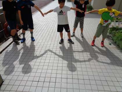 グラウンドに出たときはなかなか影ができず、しばらく待っていたところ、雲の間から太陽が出てきて影ができました。その瞬間、子供たちは友達と影つなぎをして影のでき方や向きなどをよく観察していました。