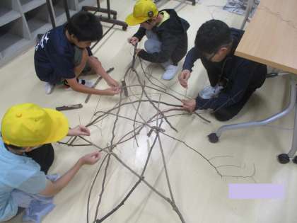 今日は雨で秘密基地の地下を掘ることができませんでしたが、1学期に集めた木で屋根の部分を作りました。