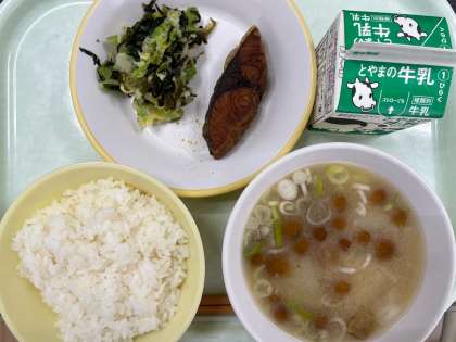 【献 立】 ごはん 牛乳 揚げ魚のレモン味 磯和え なめこ汁