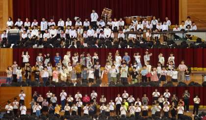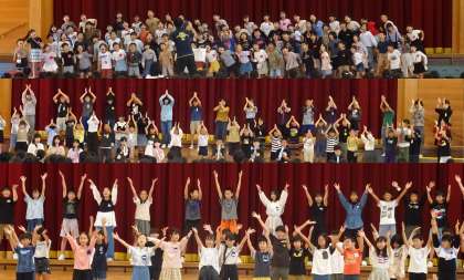 19日の本番に向けて、これまでの成果を、全校の子供たちに披露しました。