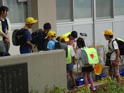1年生が育てている朝顔では、先生の鉢から大きないもむしが見つかって大騒ぎです。