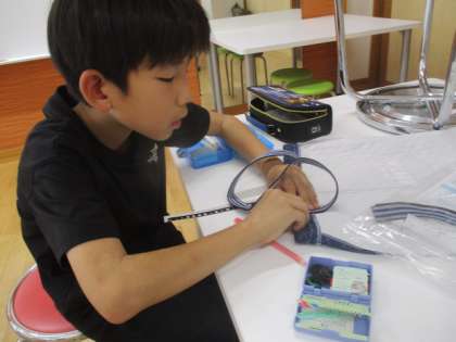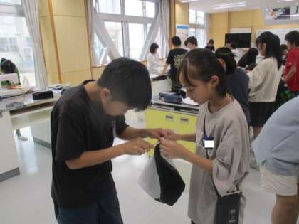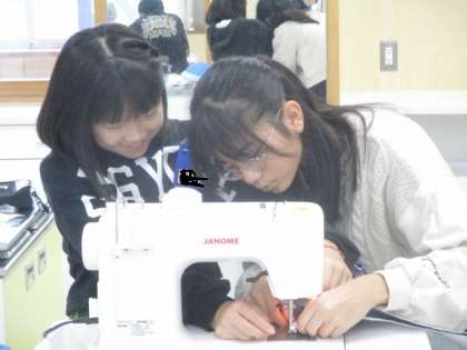 持ち手を付ける場所の印を付けたり、ミシンの糸を友達とかけたりしながら作品を作りました。