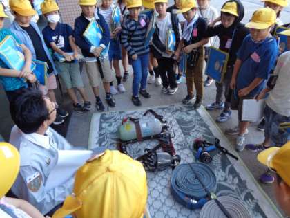 消防士の方が使う酸素ボンベや消火時に使うホースを見せてもらいました。すべて身に着けると30kgの重さになり、すばやく身動きができる消防士の方のすごさを知りました。