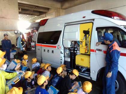 本日は消防署見学しに行きました。消防署中の様々場所を案内してもらいました。仮眠室や、食事室等様々な場所を見学できてとても勉強になりました。また火事の際の消火に必要な水の確保の仕方についても学び子どもたちは真剣に聞いていました。