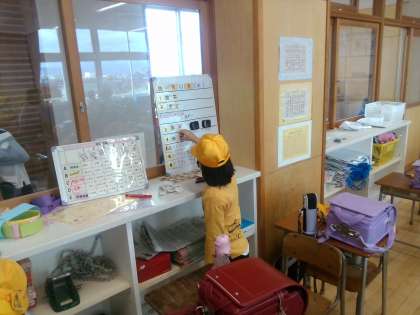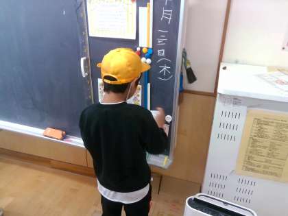 学級では自分から翌日のホワイトボードの時間割を変えたり、当番札を変えたりするなど、当番の仕事を頑張っています。また、道具箱を帰りの会の前に入れることを自主的に呼びかけています。日々子供たちの成長が感じられます。