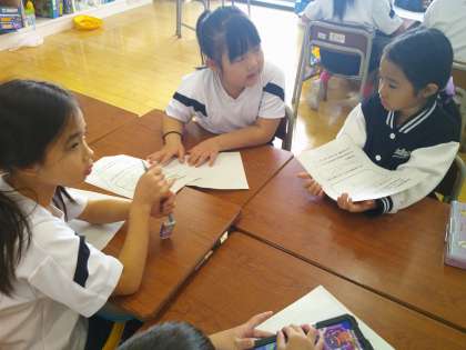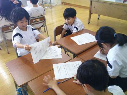 国語では、漢字の成り立ちについて調べ学習を行いました。クロムブックを活用して調べたことをワークシートにまとめ、紹介し合いました。