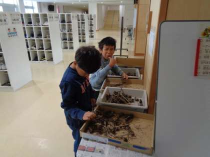 休み時間に3年生の子供が、児童玄関前に置いてあったひまわりの実から種をとっていました。
