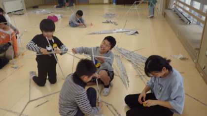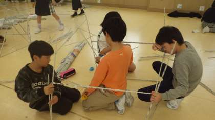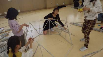 新聞紙を棒状にしたものをつないで一つの作品をつくりました。