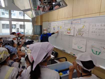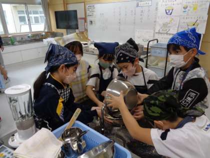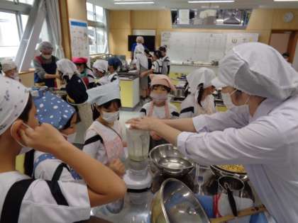 豆腐づくりについての説明をしていただいた後、子供たちは昨日から水につけておいた大豆をミキサーにかけました。