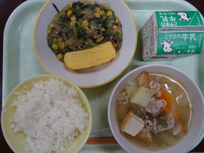 【献 立】 ごはん 牛乳 厚焼き卵 野菜のオイスターソース炒め 豚汁