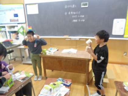 まとめの学習に、糸電話をつくって友達の声が聞こえるかを試しました。