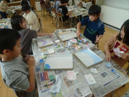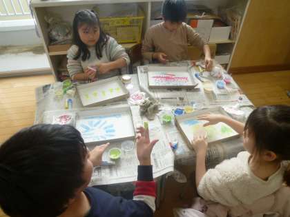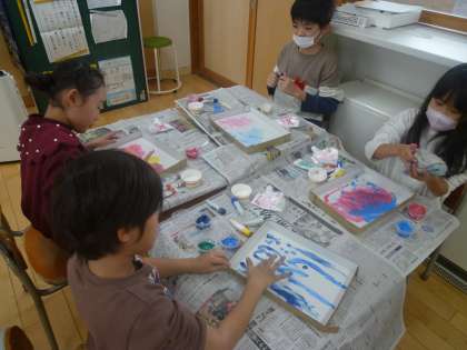 絵の具を混ぜて、伸ばしたり、手の跡をつけたりして、楽しみました。最後には、キラキラ粉をふりかけ、思い思いの作品が出来上がりました。