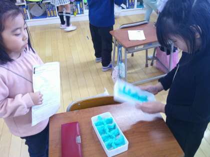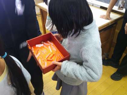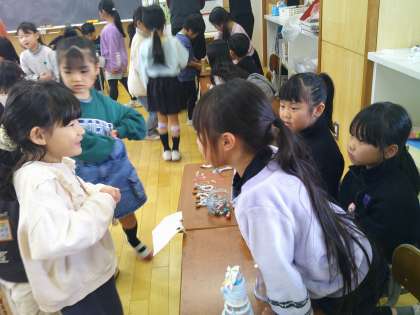 校外学習等で落ち葉や木の実などの秋に親しんできた子供たち。今日は、秋のものを使って作った遊びやかざりを、お互いのクラスで披露する「あきまつり」を楽しみました。