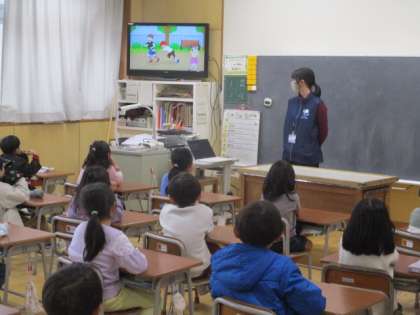 今日は、警察署の方にお越しいただき、プライベートゾーンについて学習する「くもくん教室」を行っていただきました。子供たちは真剣にお話を聞き、クイズで楽しく学習しました。