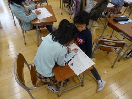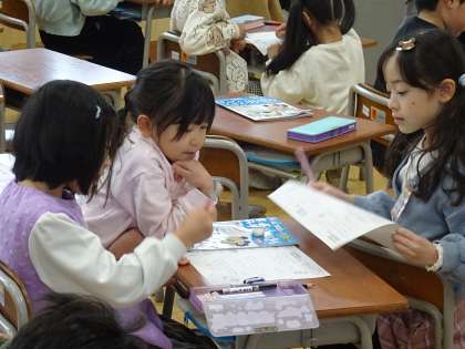 算数の時間です。友達と相談しながら問題を考えています。