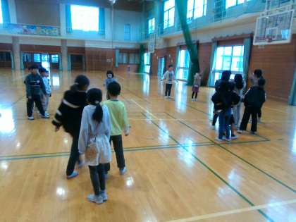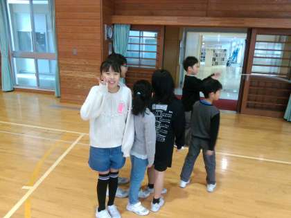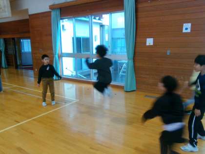 1組と2組が一緒になって仲よく大なわをしています。寒さに負けず体を動かしています。