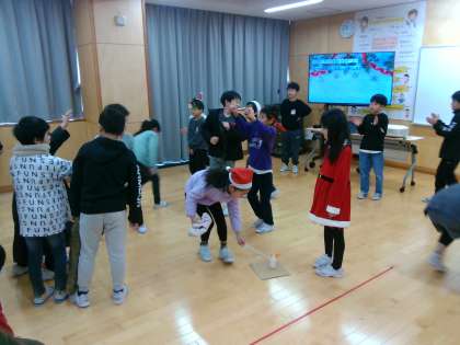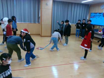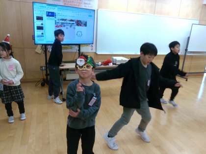 そりに乗ったサンタを、どの団が一番はやく運べるか競争をしています。実行委員が3年生の友達に分かりやすく説明していました。3年生の仲間もしっかりと耳を傾けて聞いて理解していました。3年生の成長を感じます。