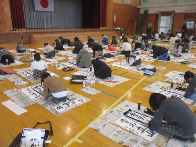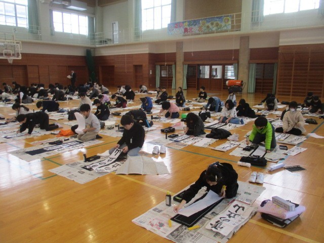 体育館で書き初め大会を行いました。どの人も静かな雰囲気で丁寧に書きました。