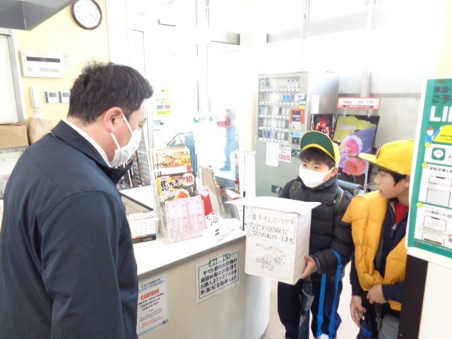 ひまわり委員会の子供がお店に行って、書き損じはがきの回収箱の設置をお願いしました。