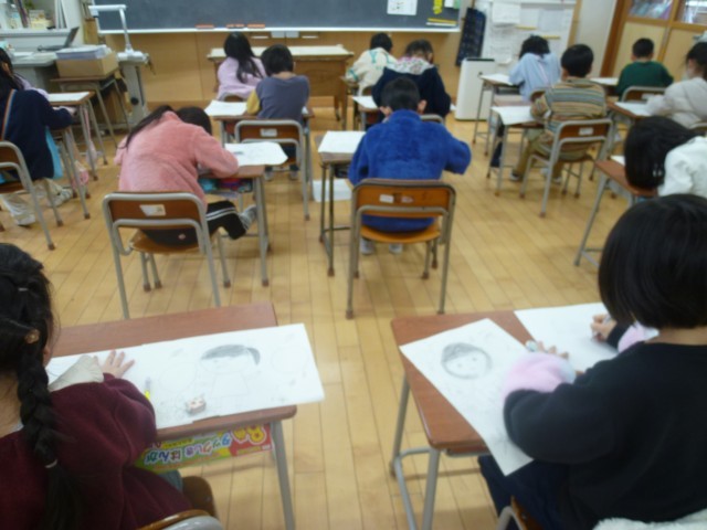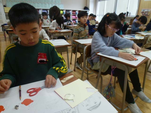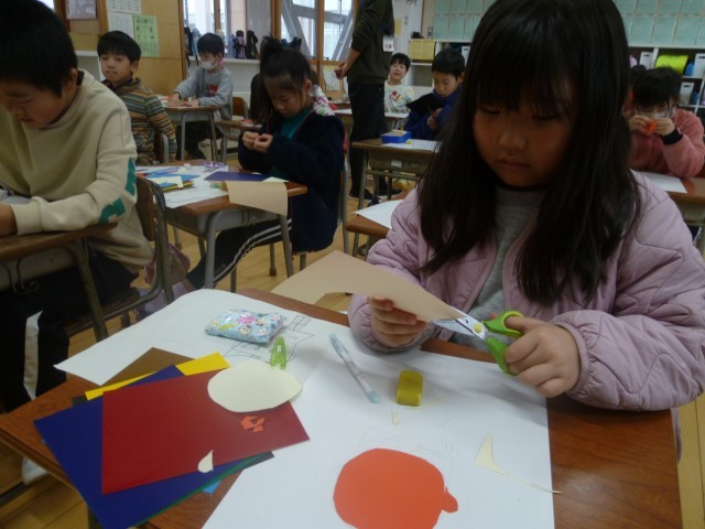 できるようになったことを版画で表しています。切って、丁寧に貼っていました。