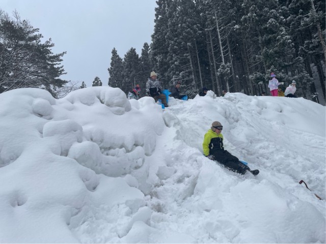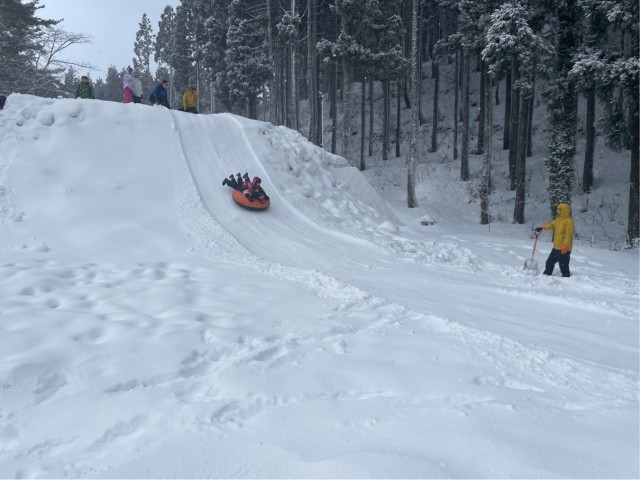 外ではスノーチューブやそりで遊んでいます。