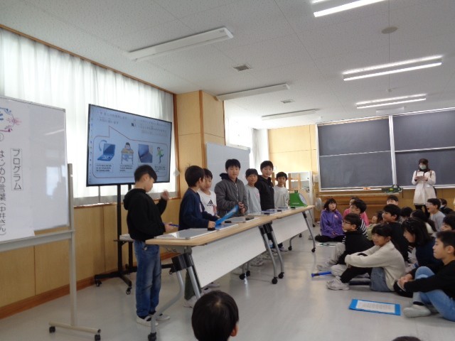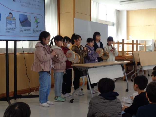 前半は図工室で、算数の大きな数の筆算や理科の糸電話、音楽の合奏などの発表をがんばりました。