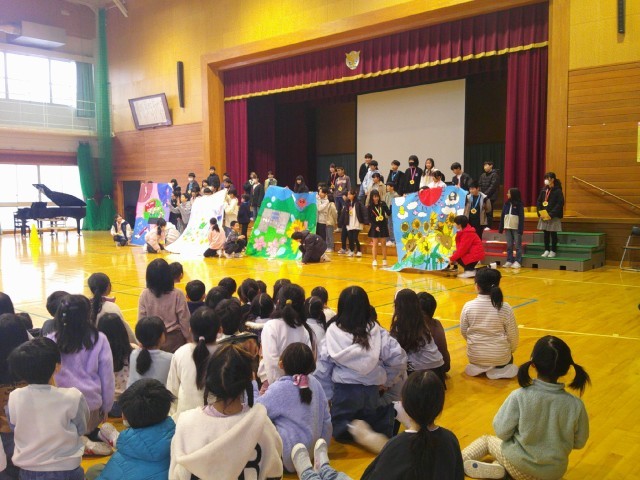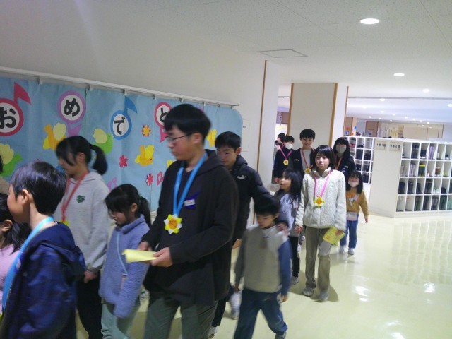 今日は、卒業を祝う会がありました。1年生は、6年生のために心を込めて折り紙のメダルを用意しました。今日は、お世話になった6年生へメダルを渡し、会場へ手をつないで入場する仕事をがんばりました。また、ダンスや歌で、6年生への感謝の気持ちを伝えました。