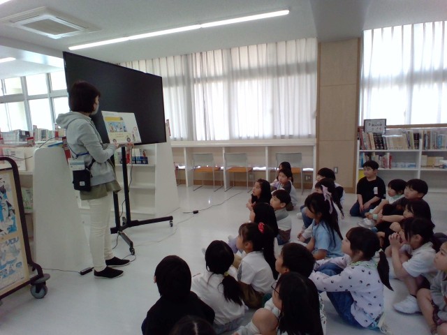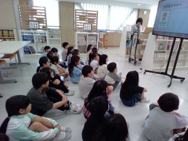 図書室を利用するのを楽しみにしていた2年生。今日は、図書室オリエンテーションがありました。図書室の約束を確認したり、司書の先生から、図書室においてある本の種類についてわかりやすい、絵本を読んでもらいました。