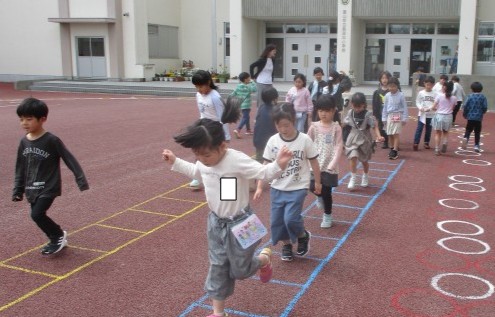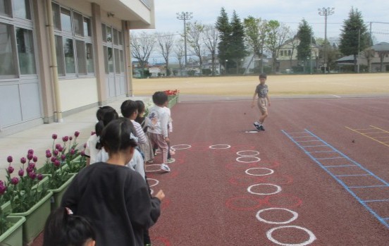 その後、ひまわり広場に行って、みんなで楽しくルールを守って遊びました。ケンケンパでは、ペースの遅い子にも急かしたりせず、優しく接する子供の姿が見られました。