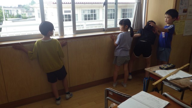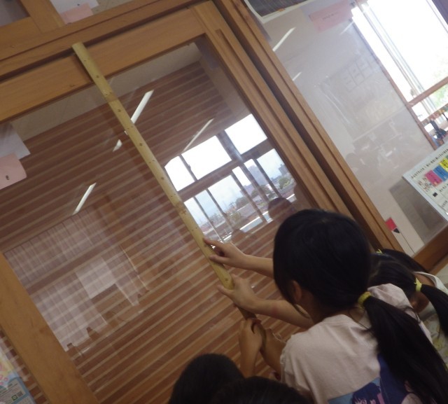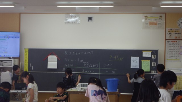 1mものさしや巻き尺を使って教室の長いものの長さをはかりました。1mより長いものをはかるときは、まきじゃくを使ったら簡単にはかれることが分かったようです。