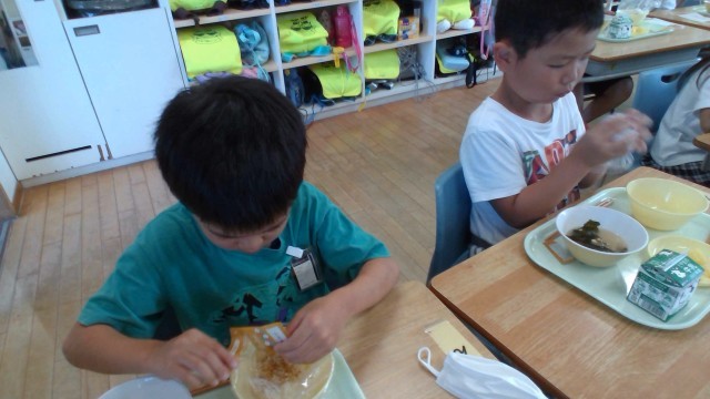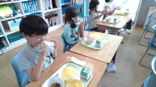 今日の給食では、防災食をいただきました。子供たちは、初めて「セルフおにぎり」を作りました。ナイロン袋に入れたご飯をぎゅっと握って、思い思いの形にして食べました。「おにぎりにすると、食べやすいね」と言っている子供もおり、いつもよりたくさんのご飯をいただくことができました。水を大切に使うことや備蓄してある食材を活用することの大切さを学びました。