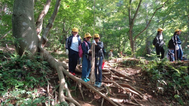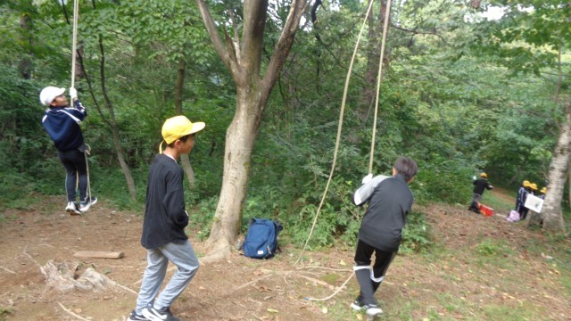 ワイルド遊びの様子です。ワイルドゾーンで木やロープを使い、思い切り遊びました。