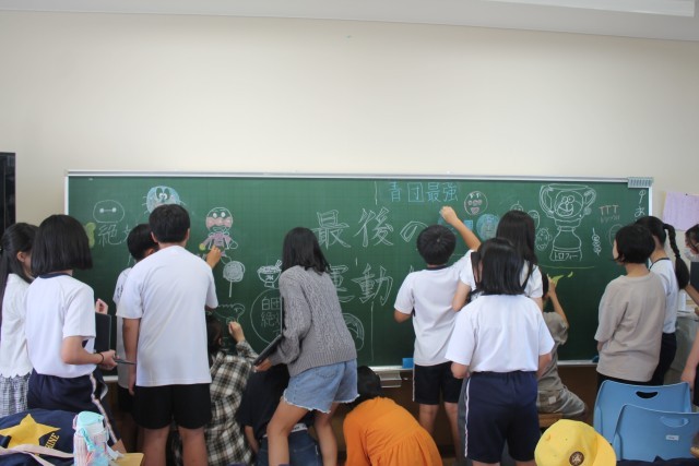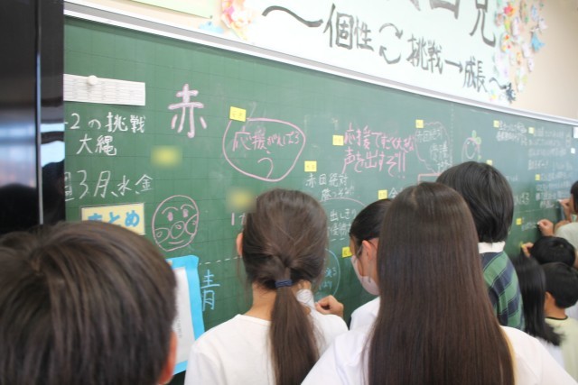 6年生 運動会~練習~ 公開日 2025/10/20 更新日 2025/10/20 6年生のページ 運動会本番に向けて、6年生で何度も対話を重ねて応援をつくり上げました。全校での練習が始まってからは、最高学年として下級生に心配りをしたり、団を盛り上げようと元気いっぱい声をかけたりする姿が見られました。運動会前日には、運動会への意気込みを寄せ書きし、気持ちを高めました。 +5