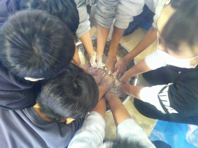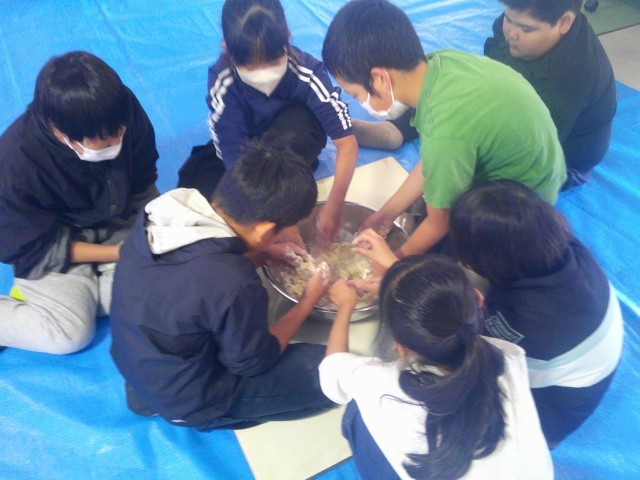 1日目は、初めに学校で出発式をしました。呉羽青少年自然の家に着いてからは、うどん作りをしました。班のみんなで600回も生地を捏ねた後、丁寧に一本一本に切りました。仲間と作ったうどんは今までで一番おいしかったです。