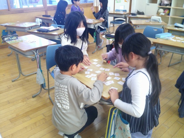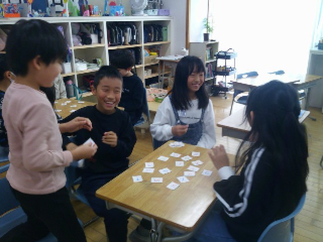 大文字の形や発音に慣れ親しむ3年生。ALPHABETかるたで楽しく大文字に慣れ親しみました。
